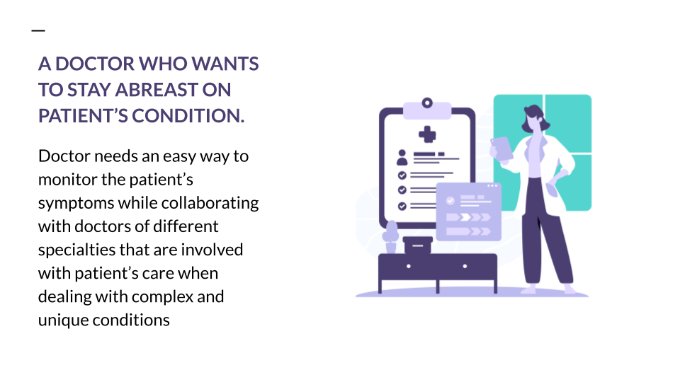 Another type of persona was one of a doctor when treating a patient and wanting to keep track of their progress and treatment plan. This persona highlighted factors like time constraints, the need for accurate and efficient data entry, and the importance of clear, actionable insights. By understanding these needs, the team could design solutions that would enable doctors to have a better insight into the progress patients make and how their symptoms change throughout their treatment on a regular basis. Ultimately, this approach ensured that the tools developed were tailored to support doctors in providing transparent communication with patients.