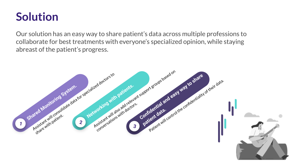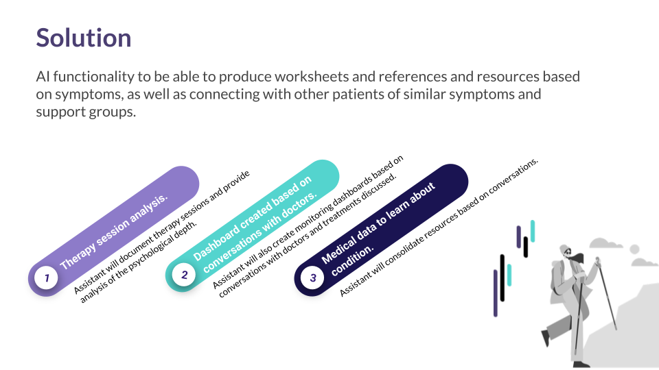 The project evolved into a startup idea. An AI tool provides information through networking, research, and data users can track to save money and time when dealing with unique conditions where symptoms may be overlapping. It would give access to more types of treatments and options to choose from and a transparent communication with their doctors.