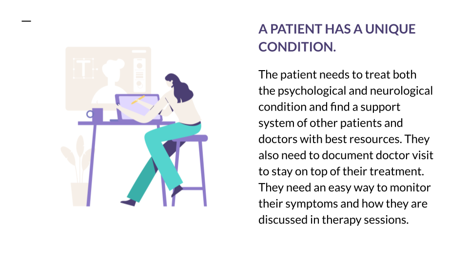 Personas played a role in helping the team better understand patients and their unique needs when tracking symptoms and treatments. One of the first personas the team looked into was the persona of a patient, analyzing their specific scenario when looking for relevant information about their condition and wanting to track their unique conditions and symptoms. This approach illuminated the challenges patients face, such as managing complex treatment regimens or tracking fluctuating symptoms, and highlighted the emotional and practical considerations that influence their behaviors.