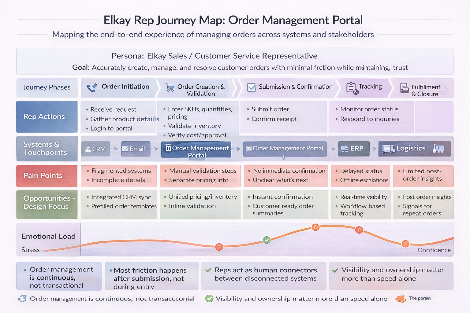 The myELKAY Order Management Portal applies Elkay’s design system to transform complex order and account data into clear, scannable, and action-oriented interfaces, enabling enterprise users to work efficiently while reinforcing trust in the Elkay brand.