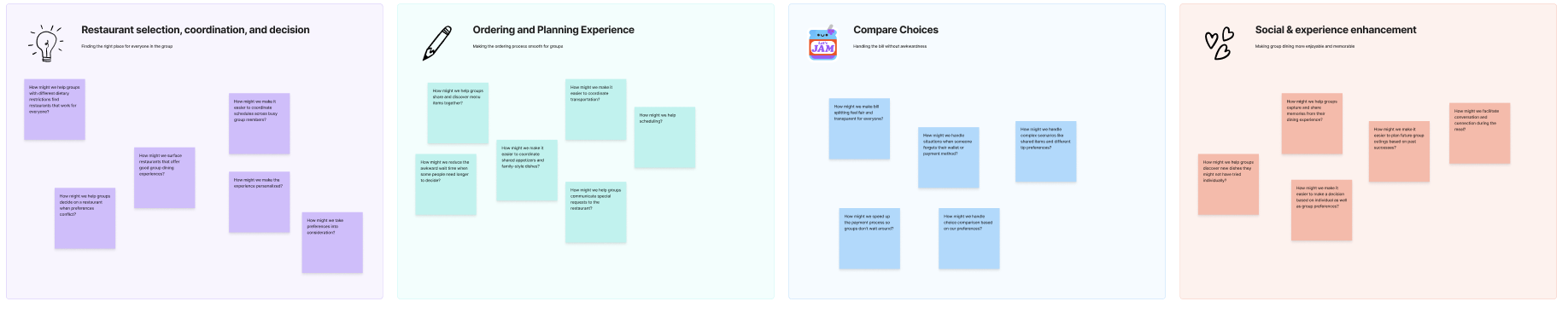 Before defining specific scenarios and solutions, we facilitated a collaborative How Might We workshop to translate user research insights into actionable design opportunities. The goal was to reframe complex behavioral, social, and logistical challenges into clear problem statements the team could align around. Together, we explored four core dimensions of the group dining experience—restaurant selection, personalized experience among groups, comparison of choices, and social experience—to identify where friction, negotiation, and decision fatigue most commonly occur. This exercise helped the team move from isolated pain points to a shared understanding of the broader system, ensuring that subsequent concepts addressed root problems rather than surface symptoms. The outputs of this workshop informed the scenarios, feature exploration, and solution concepts that followed.