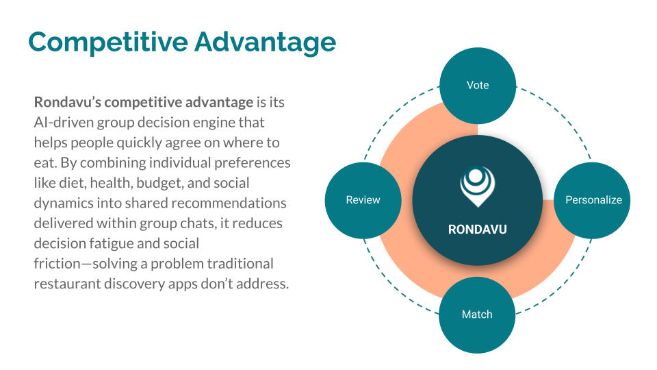 This value proposition workshop synthesized user research, behavioral insights, and business considerations into a clear, shared understanding of Rondavu’s purpose and differentiation. By mapping user pain points—such as decision fatigue, social pressure, and conflicting preferences—against user and business value, the exercise clarified how Rondavu’s conversational AI mediates group consensus rather than simply generating recommendations. The outcome aligned stakeholders around a group-first decision model that reduces friction, supports healthier and more inclusive choices, and naturally fits into existing social conversations. This framework not only articulated a compelling user promise but also established a scalable foundation for growth, partnerships, and future feature prioritization.