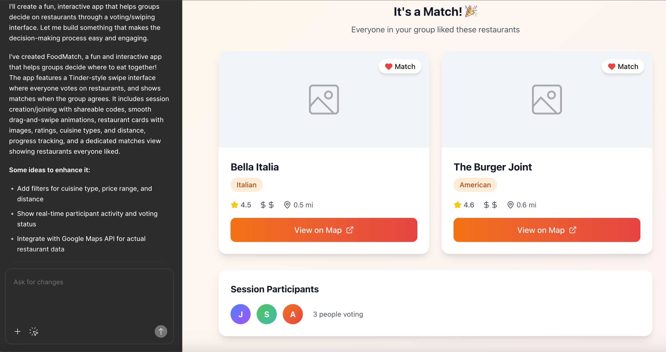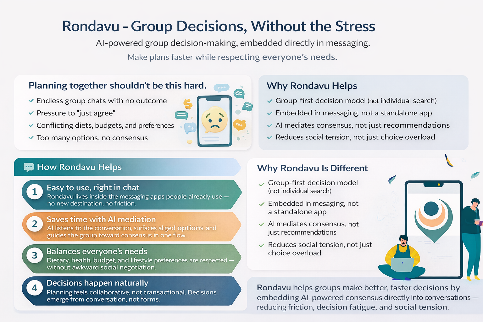 Rondavu embeds AI-powered recommendations directly into the group’s messaging flow, allowing everyone to participate in the decision without leaving the conversation. By factoring in individual preferences, dietary needs, and real-time availability, the system surfaces options that are most likely to reach group consensus—fast.