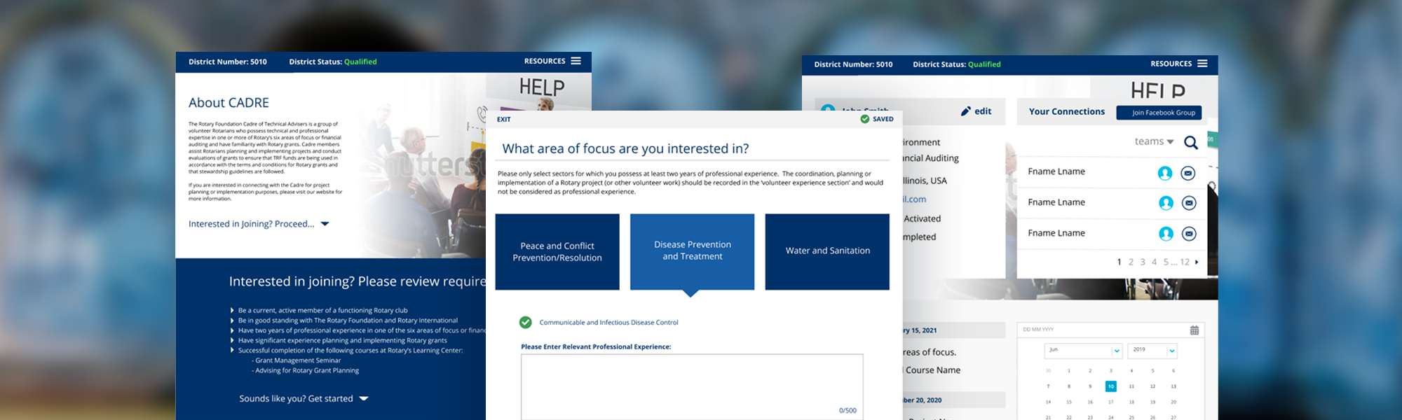 The Rotary Foundation Cadre of Technical Advisers is a group of Rotarians who volunteer to use their professional skills and technical expertise in Rotary’s areas of focus. This design project consisted of collaboration with Cadre members through user research methods and testing. The goal was to produce a layout that would be easier to follow, more user-friendly, and more personalized from the application user flow to onboarding and project selection.