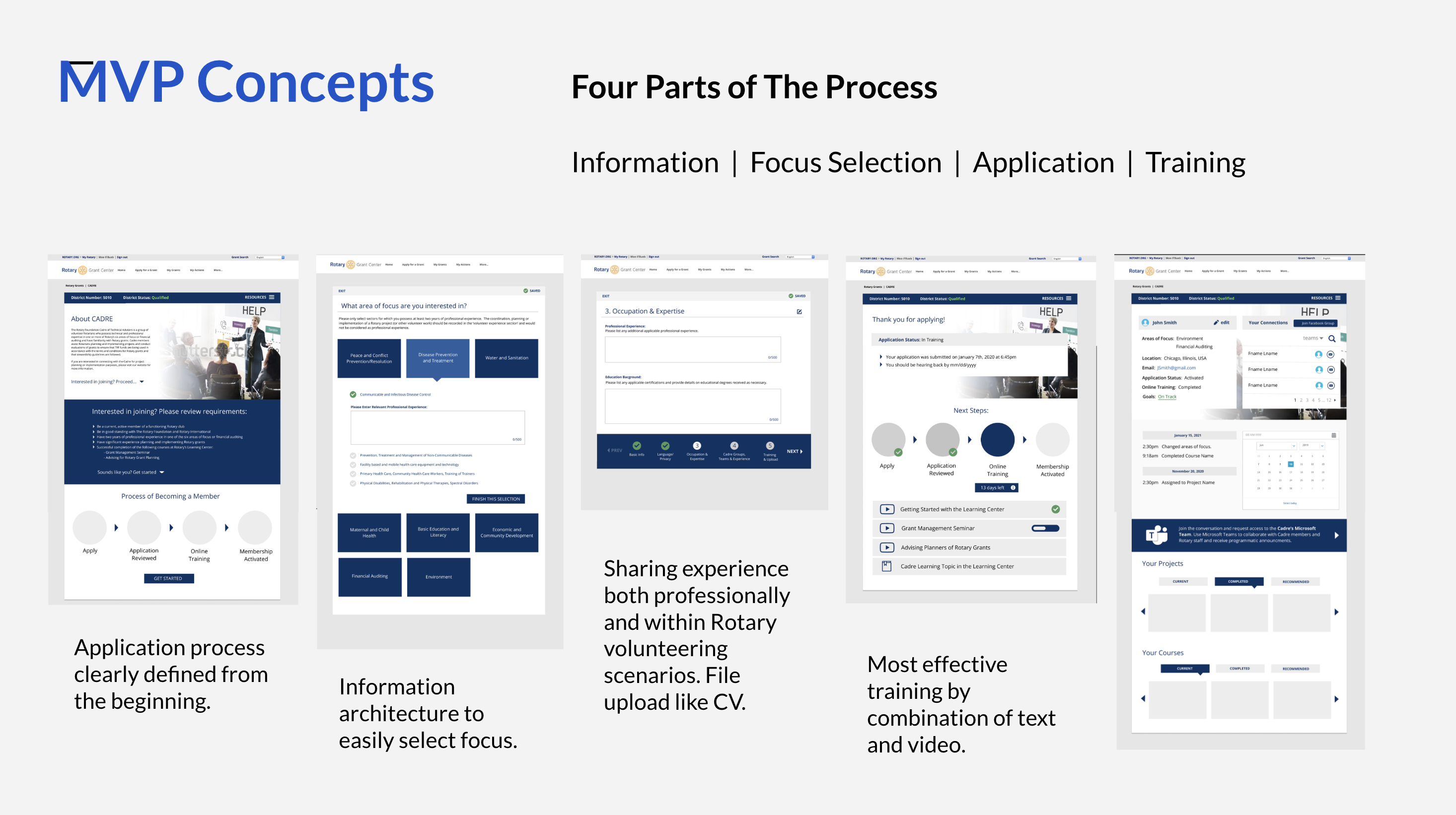 Our high-fidelity design translated research and validated flows into a clear, production-ready experience structured across four stages—Information, Focus Selection, Application, and Training—so volunteers always knew where they stood and what to do next. Via a straightforward information architecture, clear visual hierarchy, and step-by-step application flows, the interface reduced cognitive load. Incorporated feedback, progress indicators, and onboarding content were instrumental in facilitating the confidence and continuity provided from first interaction through active participation, all at the same time ensuring that an effective MVP achieved this usability, scalability, and accessibility.