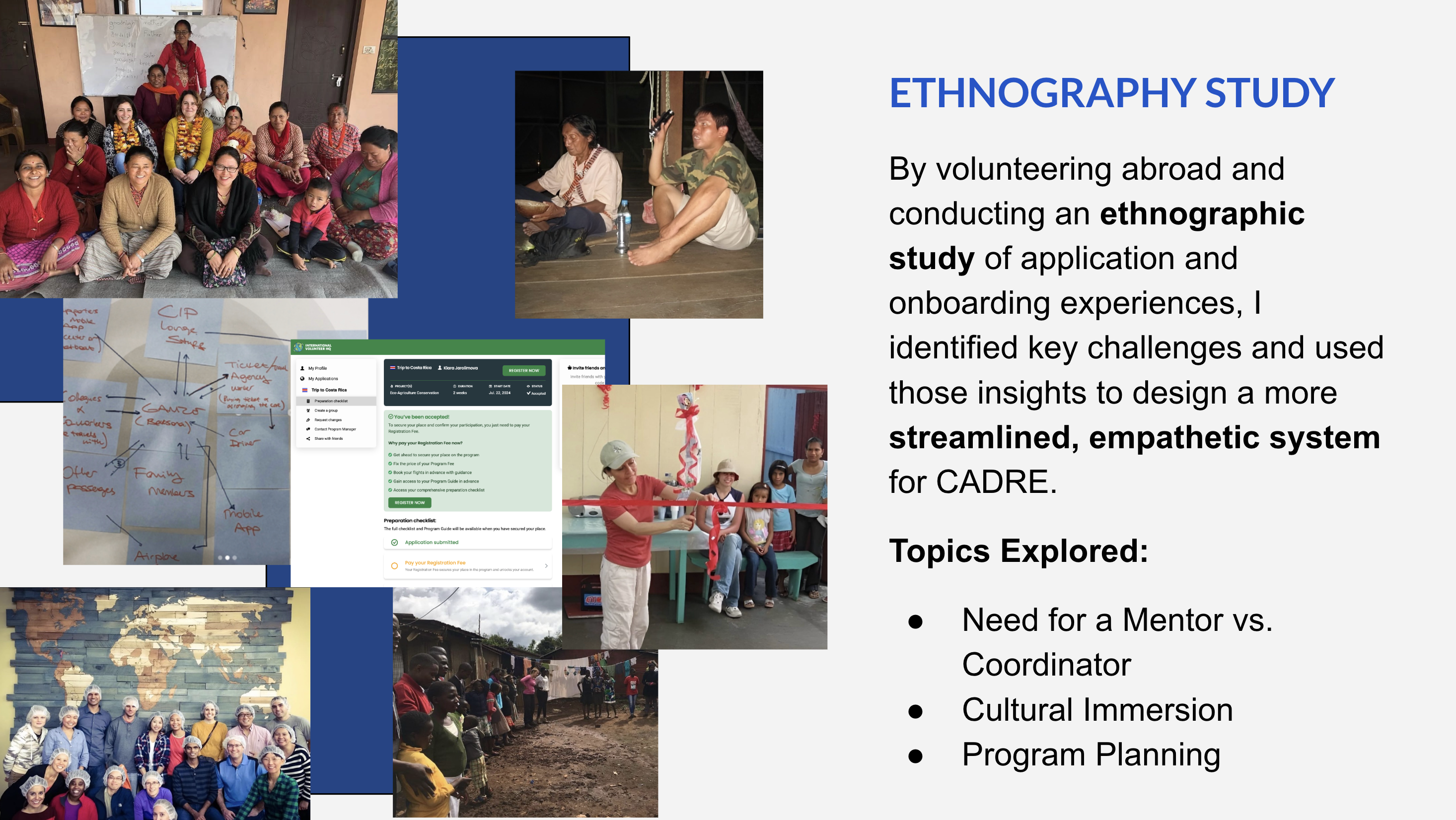 To deepen our understanding, I conducted ethnographic studies through on-the-ground volunteering and observation, allowing me to experience the application and onboarding process within real cultural and environmental contexts. This revealed how applicants navigated ambiguity, expectations, and communication gaps—insights that would not have surfaced through surveys alone.
