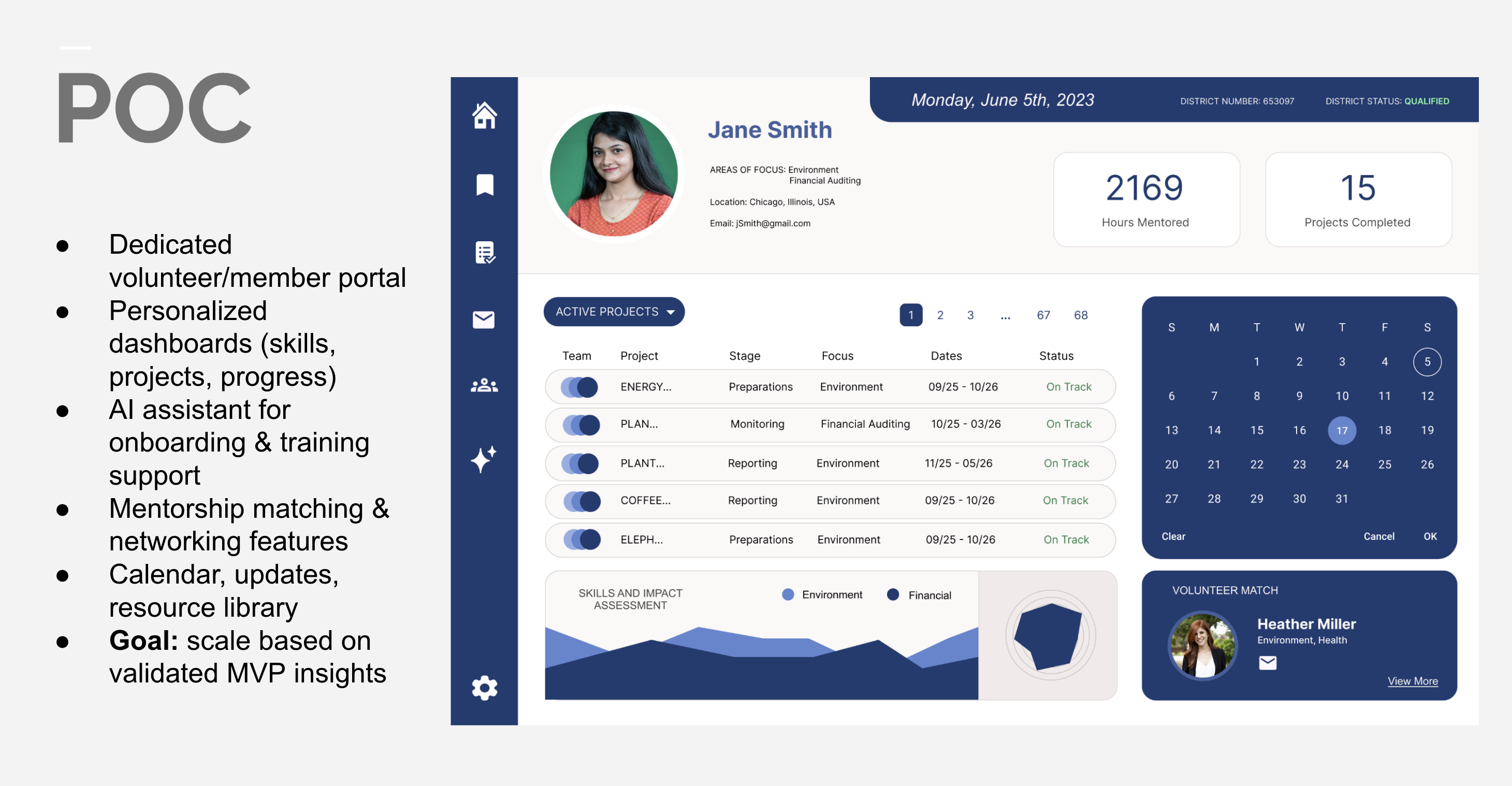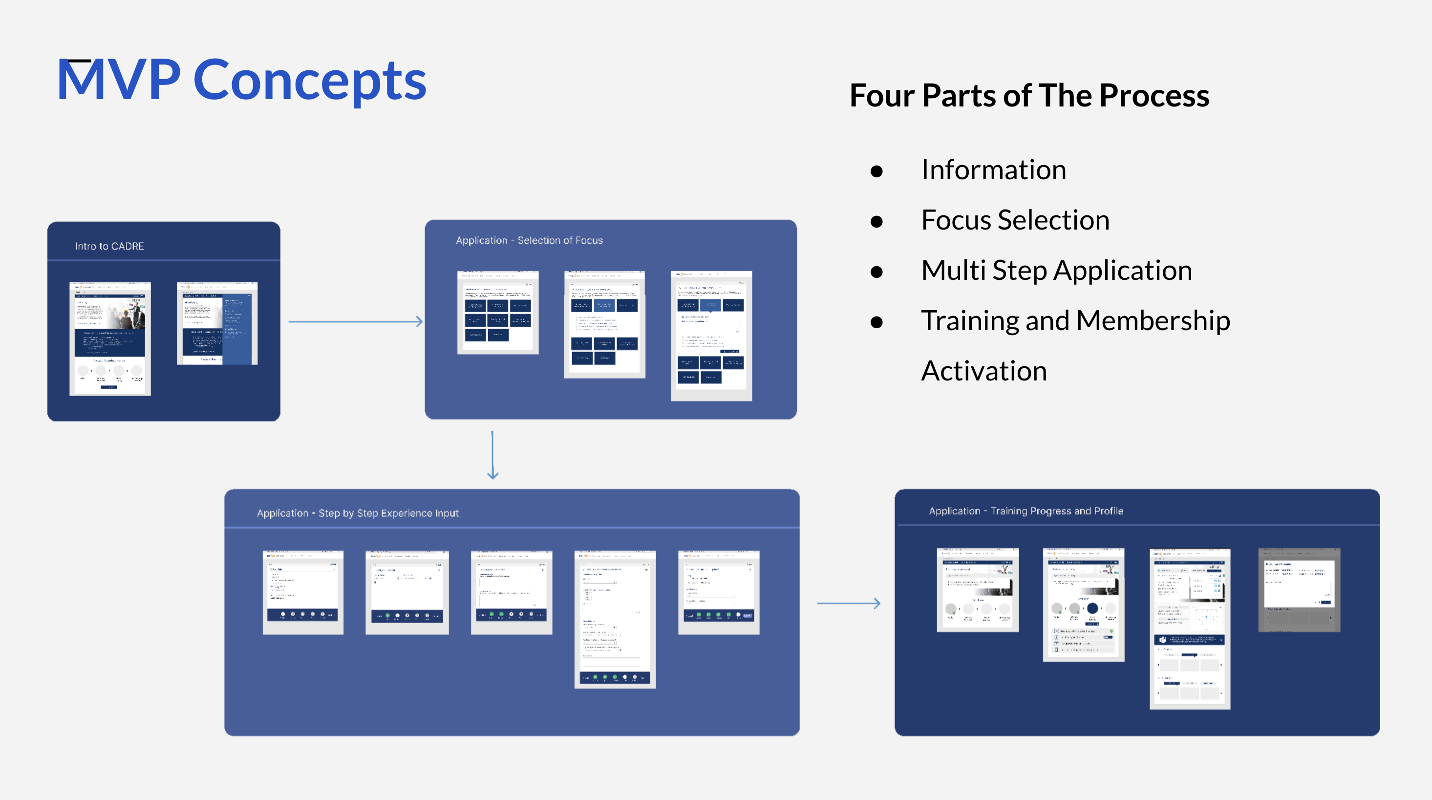 This proof of concept was informed by additional usability testing of high-fidelity prototypes, which revealed that once applicants moved beyond acceptance, their primary needs shifted from application clarity to ongoing visibility, mentorship access, and impact tracking. The POC explores how a dedicated member portal could support CADRE members throughout active project engagement.