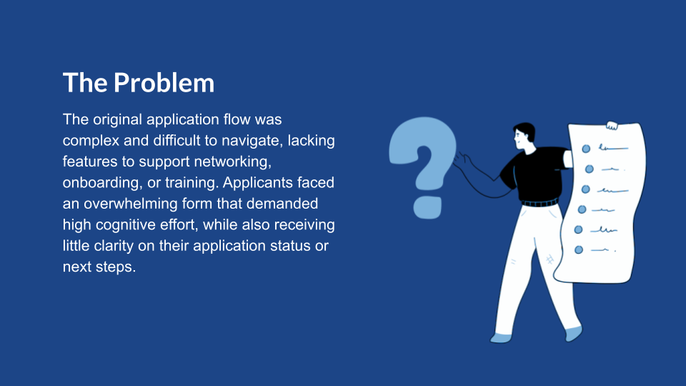 From interview insights and synthesis, we found common pain points and defined major personas representing applicants and internal stakeholders. These personas rooted design decisions in real behaviors, motivations, and constraints. Of the many valuable insights, one was the fact that applicants often felt unsure about next steps, application status, and role expectations. The application flow required a high cognitive overhead even though it provided limited feedback, which led to confusion, drop-off, and low trust.
