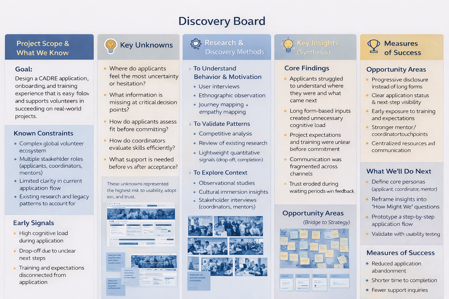 The project began with a focused discovery sprint to reassess the existing CADRE application experience and uncover critical pain points across the applicant journey. We synthesized prior research and conducted qualitative interviews, journey mapping, and empathy mapping to understand not just where users struggled, but why those moments created friction or uncertainty.