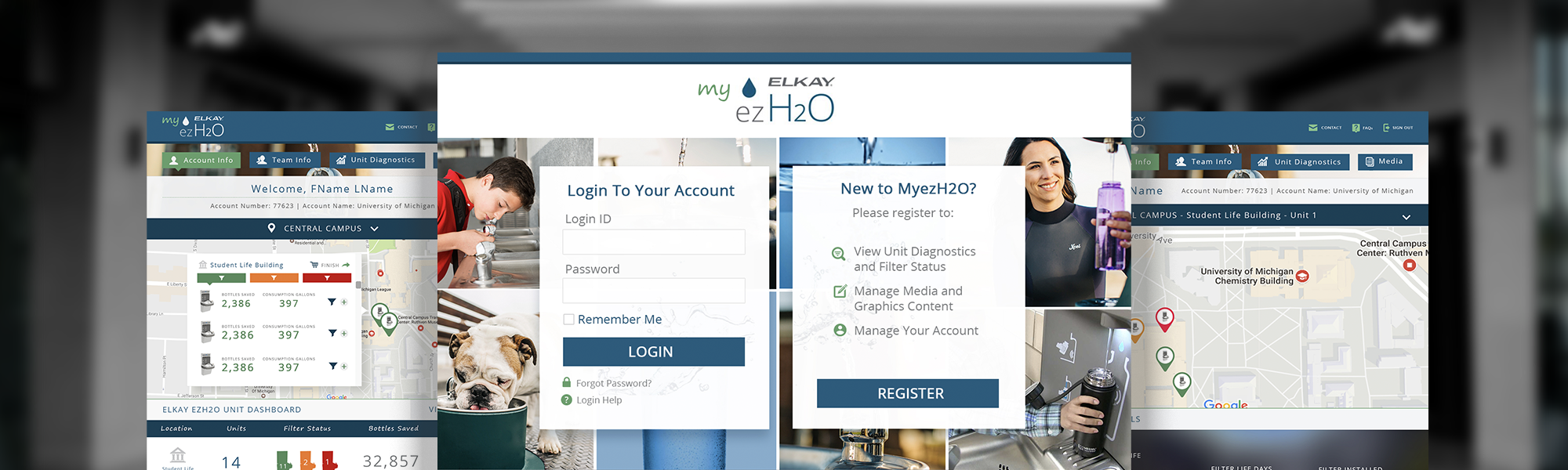 MyezH2O is an online portal that allows users to track their bottle filling stations, view unit diagnostics and filter status, manage media and graphics content, and manage their accounts. The app is ideal for businesses that use bottle filling stations across large establishments such as gyms, schools, and airports to track the number of bottles saved as well as receive reminders when a filter needs to be changed to keep the water clean and filtered.