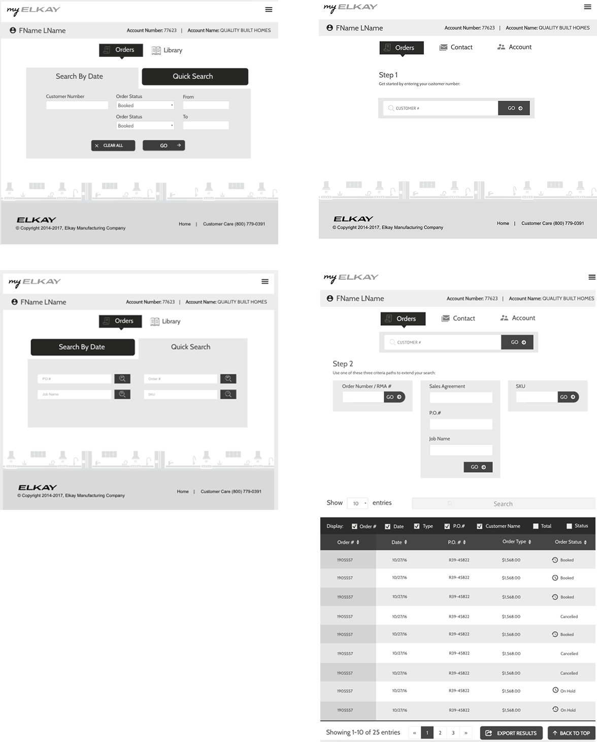 myELKAY is an internal-facing portal that supports order inquiries for Elkay sales representatives. As one of the first projects at Elkay, it introduced UXPin as a collaborative prototyping tool, enabling rapid iteration and continuous feedback across design and development. This approach strengthened cross-functional collaboration and accelerated alignment on layout and interaction decisions.