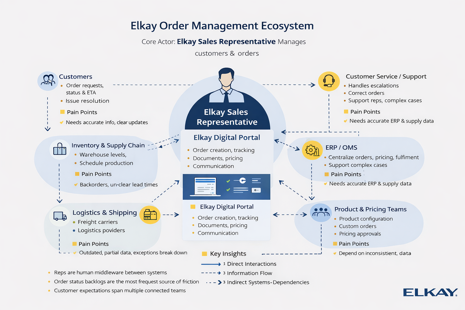 The myELKAY ecosystem supports a continuous order management journey, centralizing fragmented systems into a single portal that enables sales and support reps to maintain visibility, ownership, and customer trust across the entire order lifecycle.