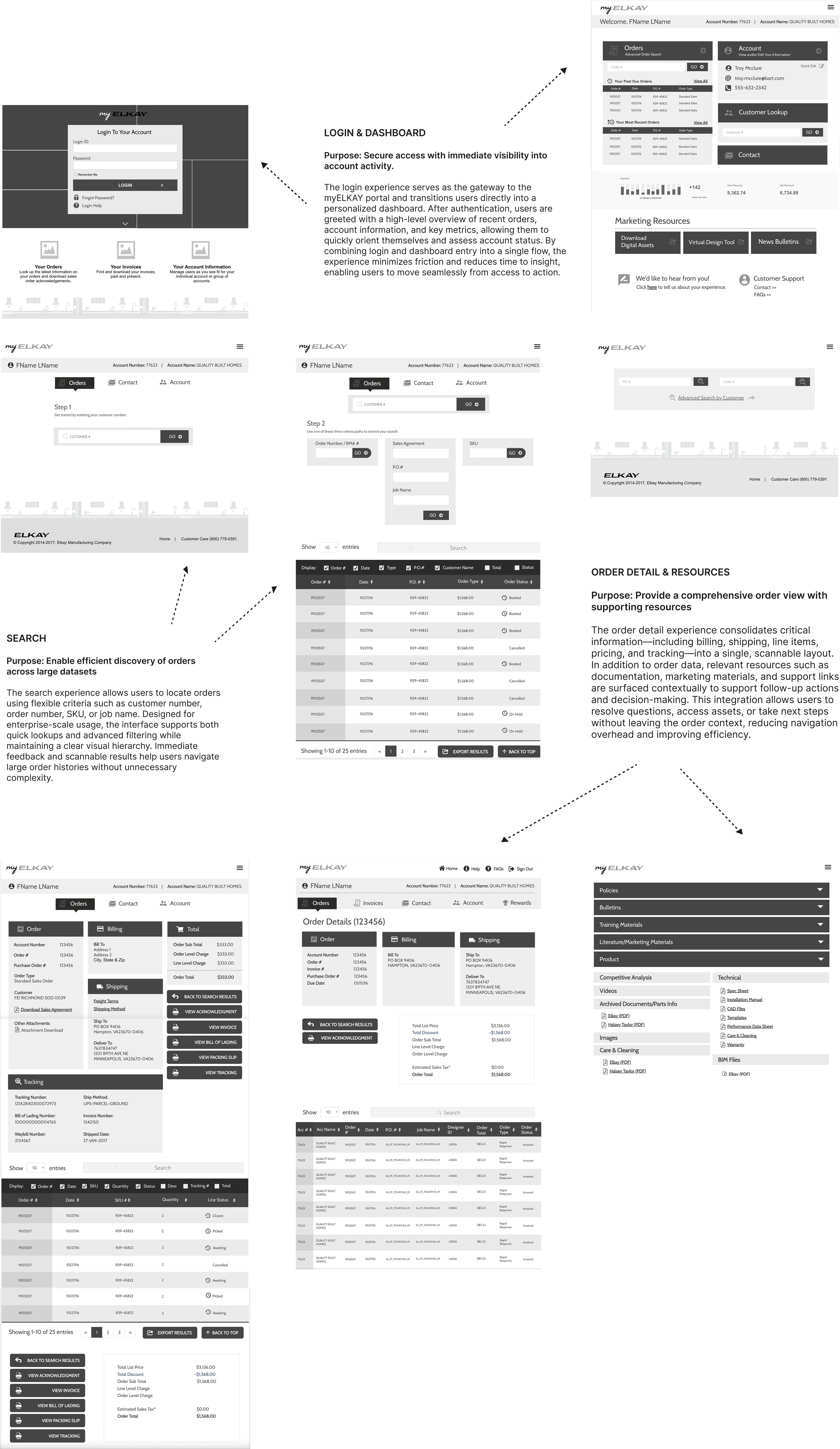 These low-fidelity wireframes were intentionally used as a collaborative working artifact between design, product, and development to validate information architecture, layout logic, and functional requirements across the myELKAY portal. By removing visual styling and brand considerations at this stage, the team was able to focus on technical feasibility, data availability, and task efficiency for key workflows such as login and dashboard access, order search, order details, and supporting resources.