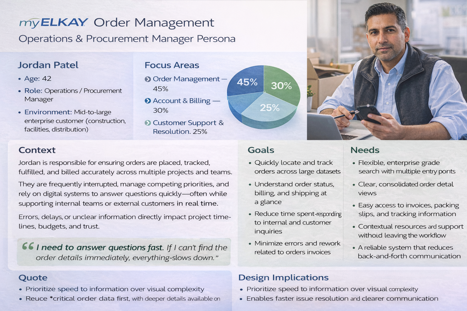 The myELKAY Order Management Portal is a management interface for operations, procurement, and customer support teams who handle large volumes of orders, invoices, and account activity across multiple projects and stakeholders. Such users must juggle tight timelines, budget accountability, and frequent internal and customer inquiries—often while working across multiple systems and data sources. It requires fast, reliable access to order status, billing, shipping, documentation, clear, consolidated views, and reduced back-and-forth communication. The experience prioritizes speed, clarity, and accuracy, enabling teams to confidently answer questions, resolve issues quickly, and keep operations moving without disruption.